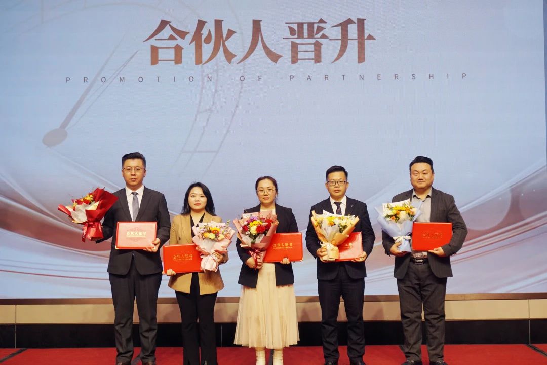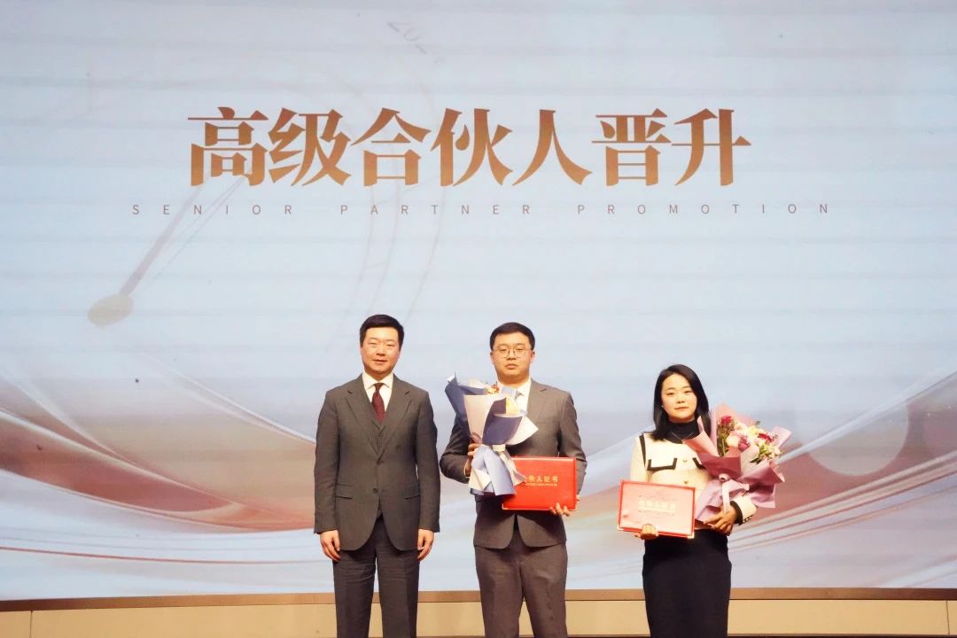 律所高级合伙人陈丹为新晋升的合伙人:李莹珺、郝震宇、王起、赵海艳、韩旭晨颁发证书,合伙人晋升代表赵海艳发言。