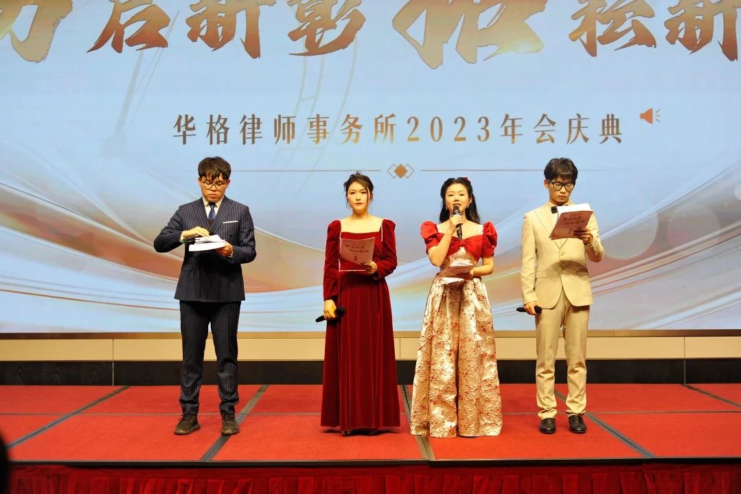 傍晚,年会庆典拉开帷幕,全体华格同仁及特邀嘉宾欢聚一堂,共庆新程,畅叙情谊。晚会由民商三部首席律师吴静、预首席律师房琦、侵权业务部实习律师汪彤、刑事二部律师助理牛天豪主持。由律师同仁们自编自演的精彩才艺节目登上舞台,为大家献上了一场精彩绝伦的视听盛宴。