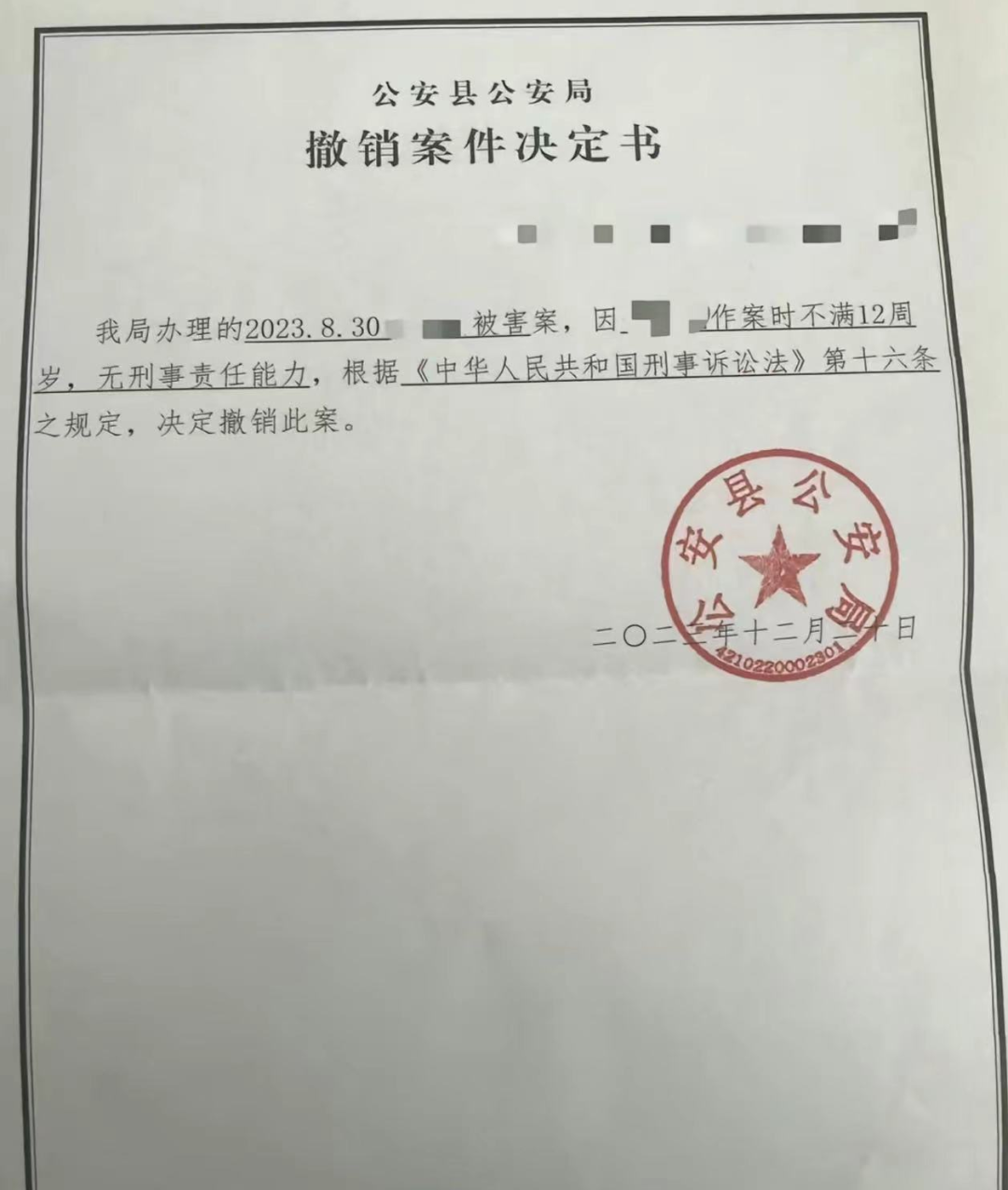 肇事男孩因被害女童与自己的妹妹经常争抢玩具等小摩擦,对被害女童积怨已久,早有想让被害女童“在世界上消失”想法,并且作案手法残忍,心思缜密,其后在被民警问话时两次撒谎欺骗民警,态度也是非常恶劣,但案发时肇事男孩未满十二周岁,无刑事责任能力,公安县公安局作出了撤销案件决定书,肇事男孩正在接受心里矫正。