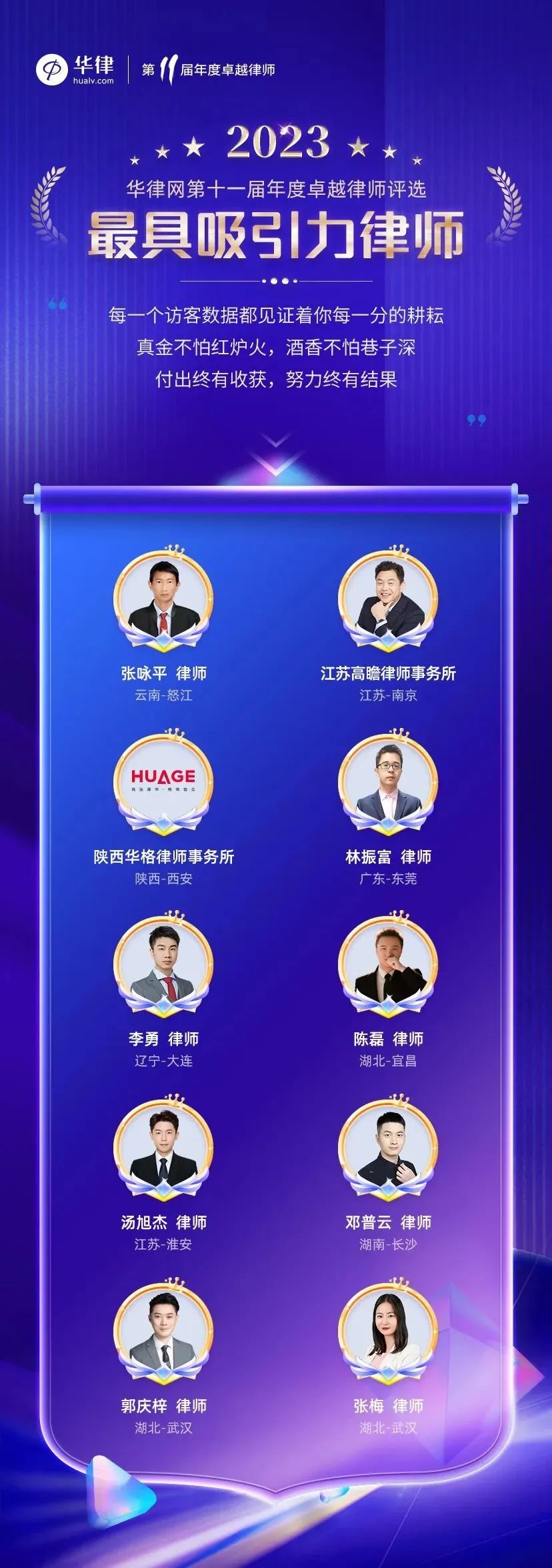 据了解,2023华律网年度卓越律师风云榜联合法律行业内专家、企业CEO、媒体大咖组成专家评审团,从27万律师中评选出100名“华律年度杰出律师/团队”,评选标准透明化、标准化、公平化,从多维度考量各报个人/单位。